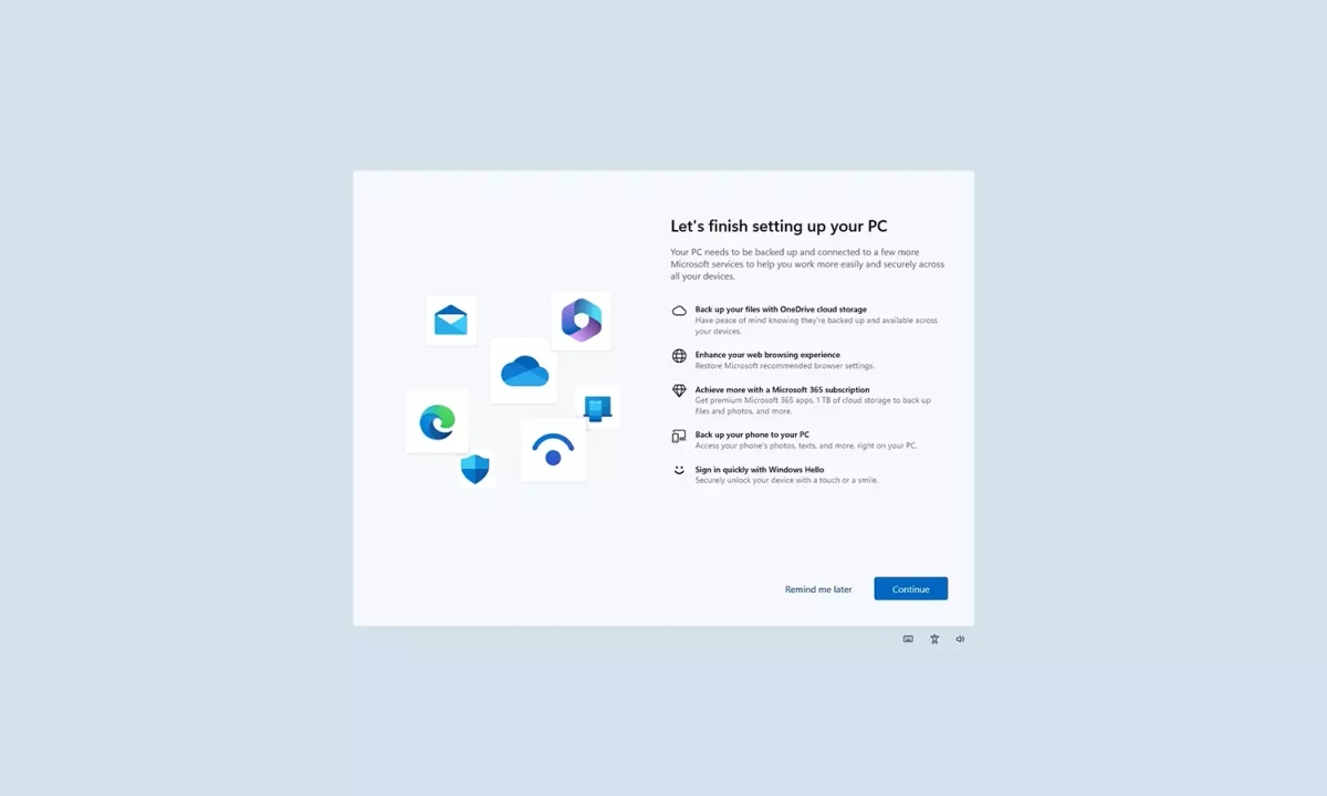 Вся реклама посвящена собственным продуктам компании, поэтому после перезагрузки пользователи видят окно «Завершение настройки ПК», где в принудительном порядке пользователю придется пройти через несколько различных окон с демонстрацией браузера, офисного пакета и других продуктов.