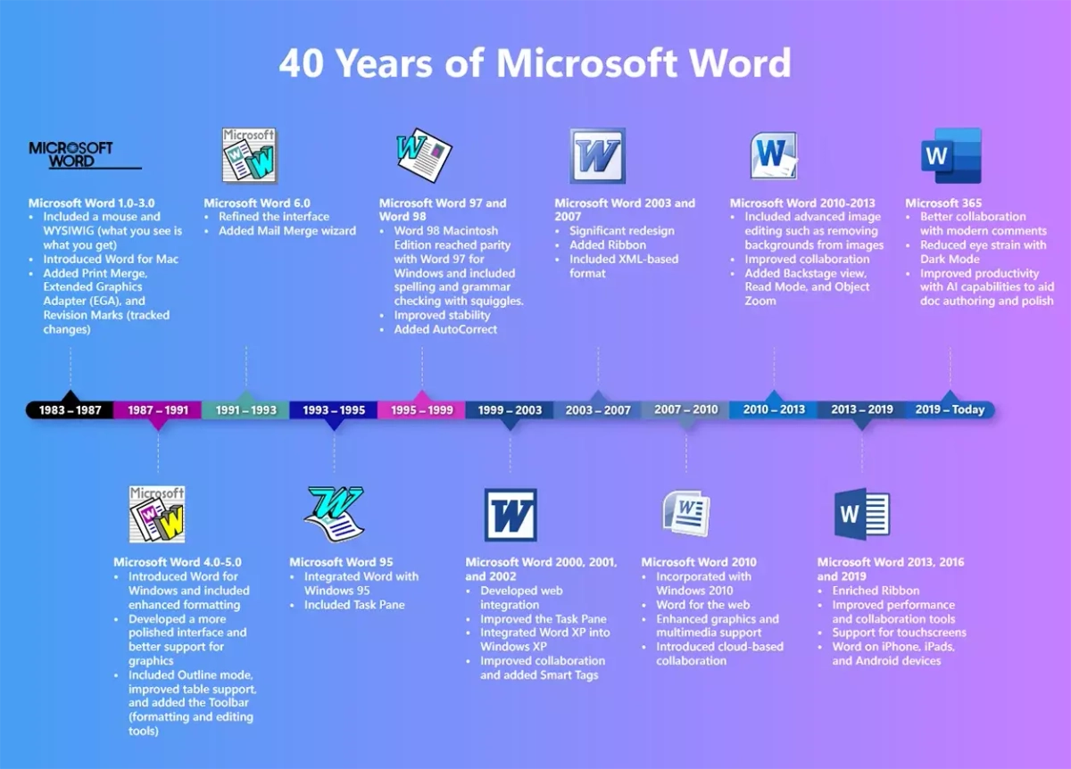 Microsoft Word является одним из старейших и популярнейших продвинутых текстовых редакторов на всей планете, и в честь 40-летия Microsoft подготовила инфографику, в которой отметила основные этапы развития своего детища.