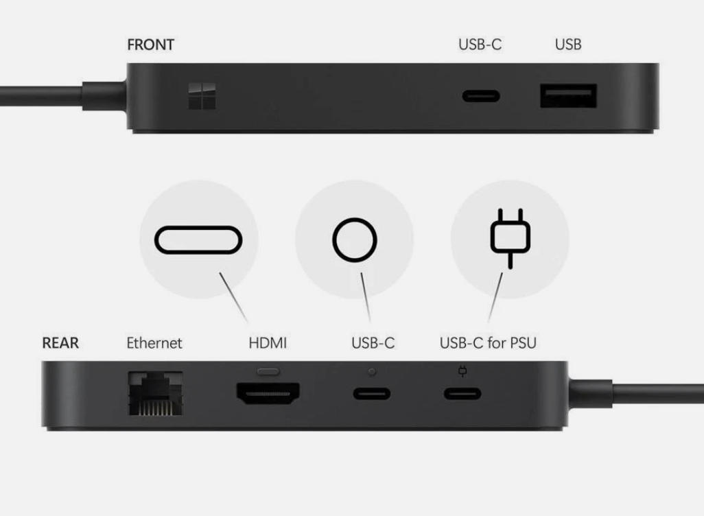 • USB-C/USB4  с кабелем 80 см и двумя индикаторами, подтверждающие подключение и зарядку вашего устройства Surface